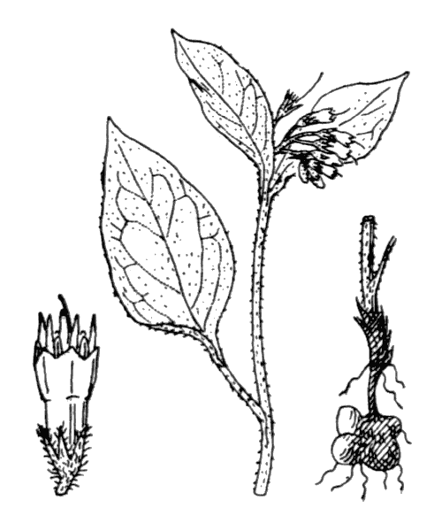 2551 Symphytum bulbosum Schimp. - Plante vivace de 20-30 cm, hérissée, à souche rampante, grêle, renflée en chapelet par des tubercules globuleux - tige grêle, flexueuse, non ailée, simple ou bifurquée au sommet - feuilles peu épaisses, les inférieures et les moyennes ovales-lancéolées, brusquement contractées en pétiole long et étroit, non ou à peine décurrentes - fleurs d'un blanc jaunâtre - calice fendu jusqu'aux 34, à lobes lancéolés - corolle de 10-12 mm, 2 fois plus longue que le calice, à lobes dressés - écailles linéaires, très saillantes, plus longues que 12 de la corolle - anthères égalant leur filet - carpelles tuberculeux, Lieux frais ou couverts, dans les Alpes-Maritimes - région basse de la Corse. Allemagne occidentale, Suisse - Europe méridionale. = Mars-avril.Source : Flore descriptive et illustrée de la France, de la Corse, et des contrées limitrophes par Hippolyte Coste (1858-1924) ; Projet de numérisation de la flore de L'Abbé Coste par le réseau Tela botanica - 2011Reproduction