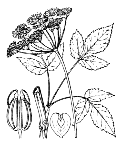 Haut. 30-90 cm. Plante glabre ; souche s'enfonçant dans le sol. Tige creuse, striée, peu ramifiée. Feuilles inf. biternatiséquées, à folioles grandes, ovales, inégalement dentées en scie, pétiole long. Feuilles caulinaires ternées, pétiole remplacé par une gaine. Ombelles à 15-25 rayons, la centrale seule fertile, sans involucre ni involucelle. Pétales blancs. Fruit ovoïde-oblong, glabre, comprimé, long d'env. 3 mm, à stylopodes coniques ; méricarpes à 5 côtes filiformes.