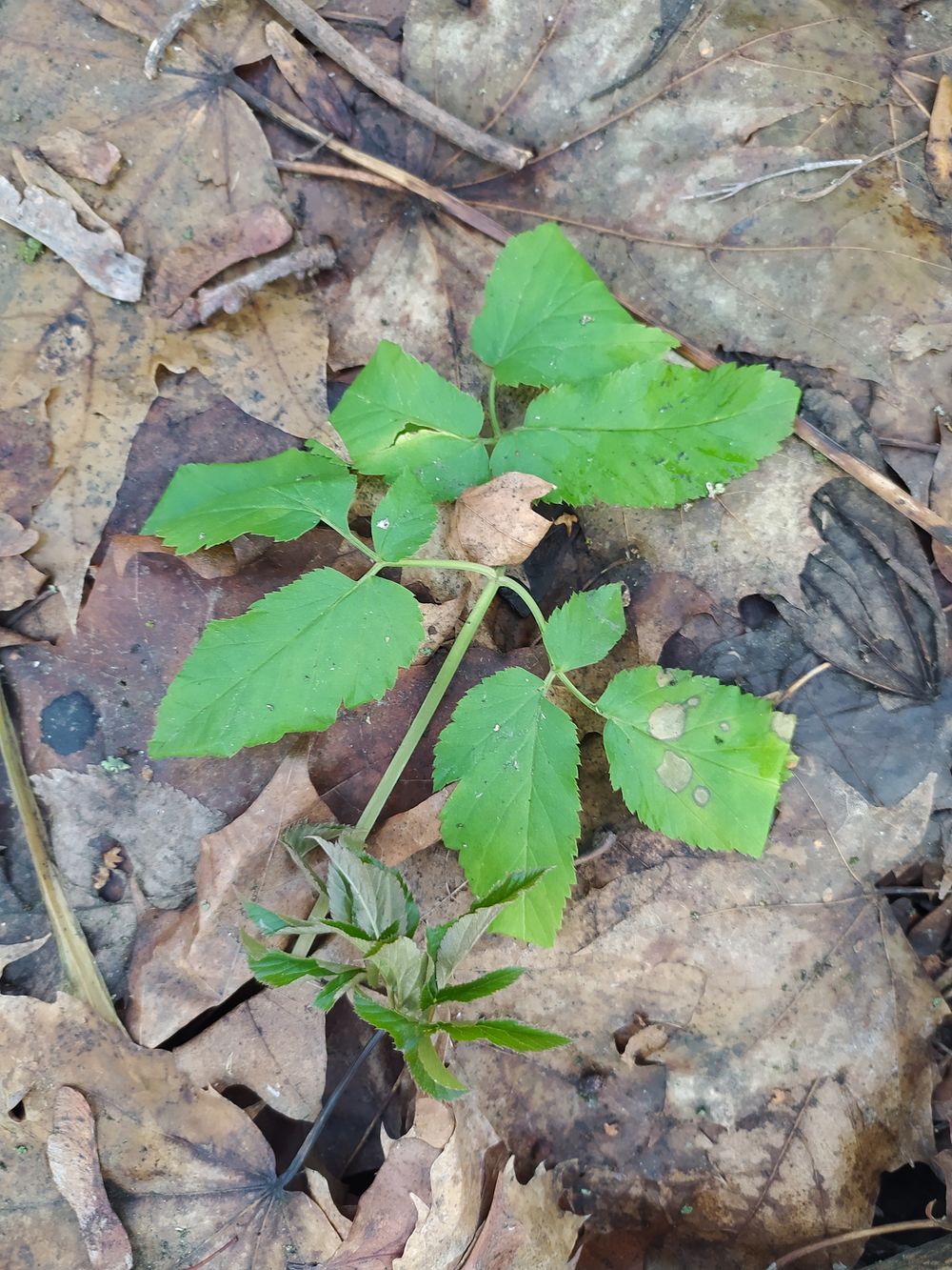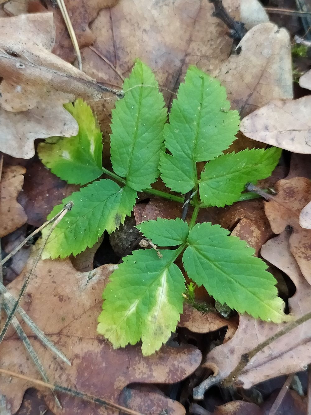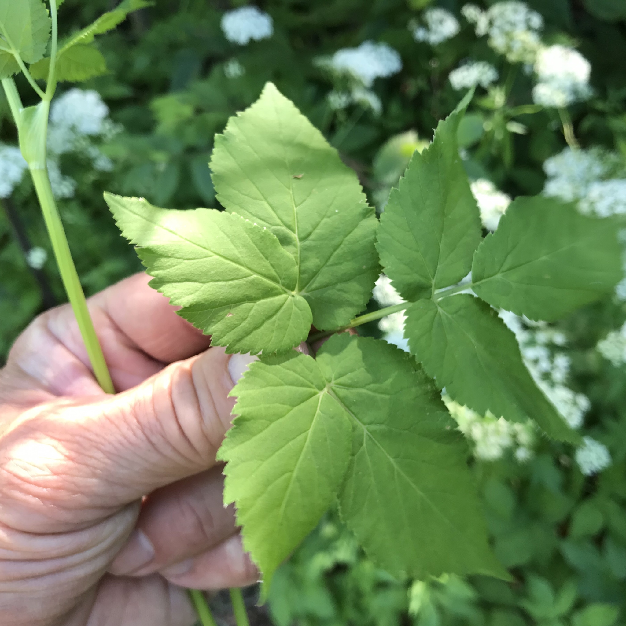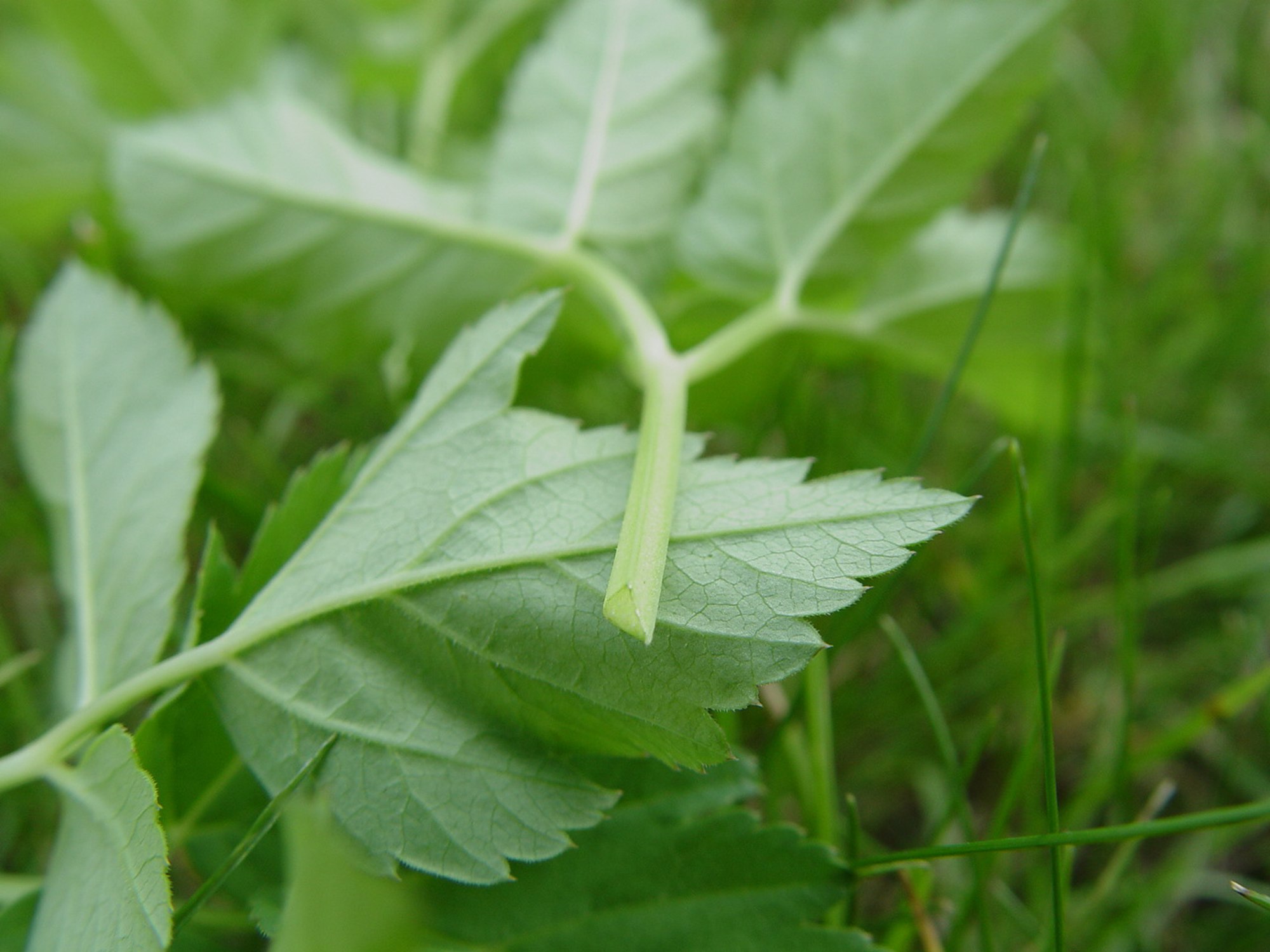 - feuilles inférieures longuement pétiolées, biternées, à folioles larges de 3-4 cm, ovales-lancéolées, aiguës, inégalement dentées en scie, les caulinaires sessiles sur la gaine et ternées