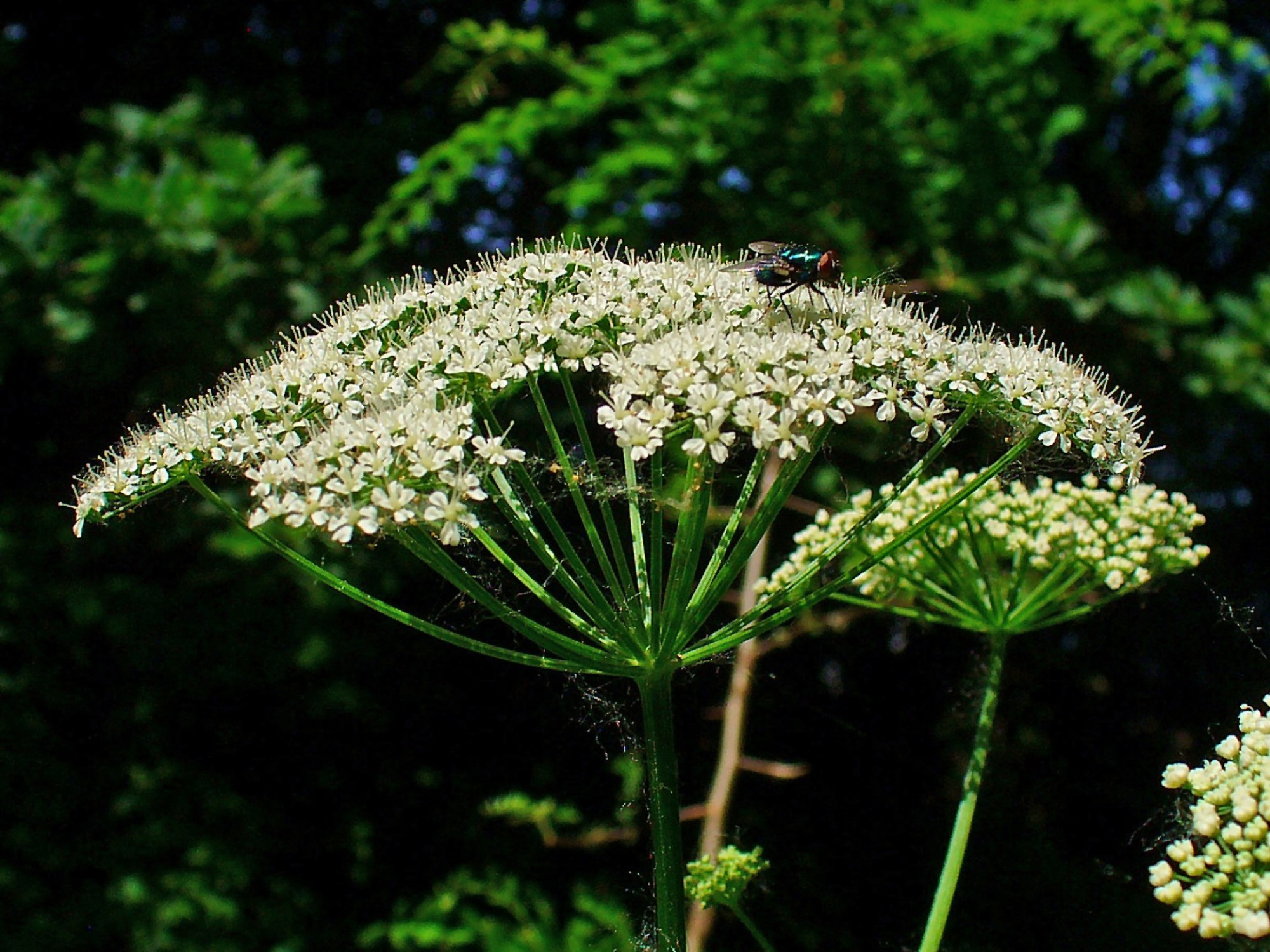 - fleurs blanches, en ombelles à 12-20 rayons grêles presque égaux, la centrale seule fertile