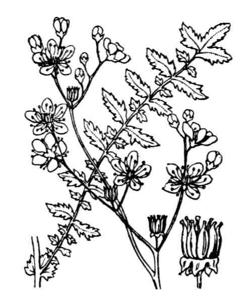 Haut. 30-80 cm. Racines à tubercules ovoïdes. Feuilles imparipennées, à 10-40 paires de folioles, ovales-lancéolées, incisées-dentées, alternant avec de petites folioles intercalées. Foliole terminale trilobée. Feuilles basales nombreuses. Fleurs blanc crème, gén. à 6 pétales, lavés de rose à l'ext., en corymbes rameux et multiflores. Carpelles dressés, non enroulés en spirale, pubescents.